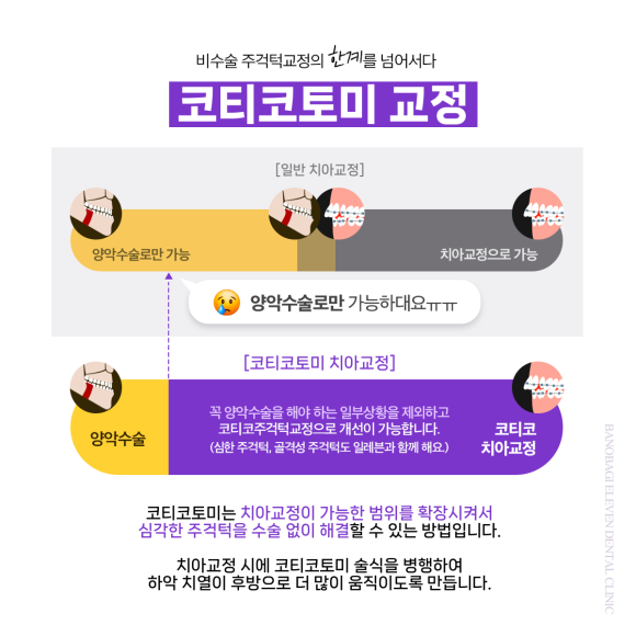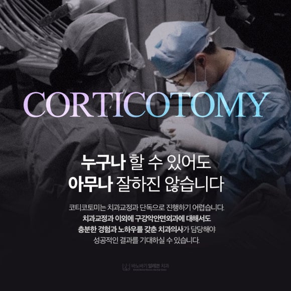 코티코토미는 이러한 한계를 극복하기 위한 보조적 시술로, 잇몸뼈의 겉부분인 치조골에 적절한 자극을 부여해줌으로써 영구치의 가동범위를 충분히 확장시켜준다고 알려졌습니다.