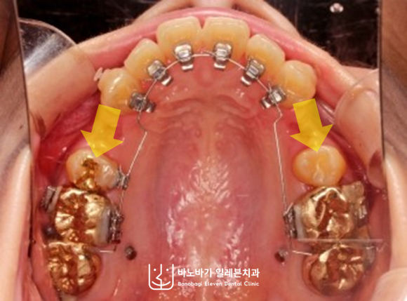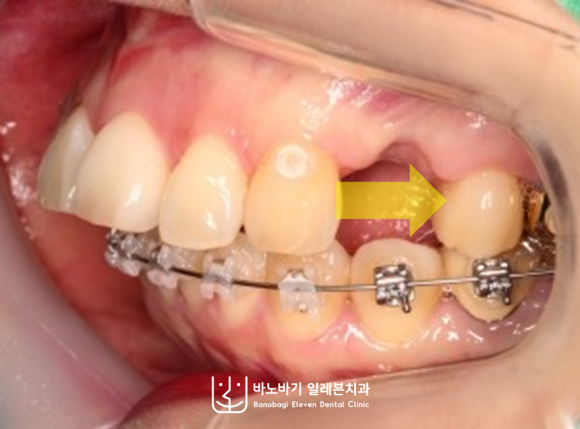 그래서 윗니 양쪽에서 각각 첫번째 소구치를 제거한 후, 전치부 전반을 뒤로 충분히 움직여주기로 결정했습니다.
