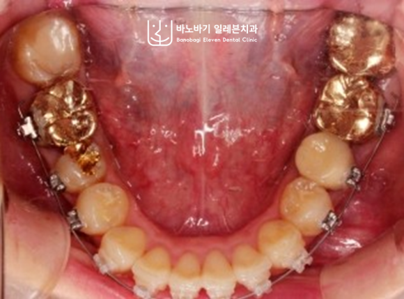아랫니는 발치 없이 영구치를 모두 온전히 보존하였습니다. 더불어 코티코토미 시술을 통해 급속교정이 이루어졌습니다.