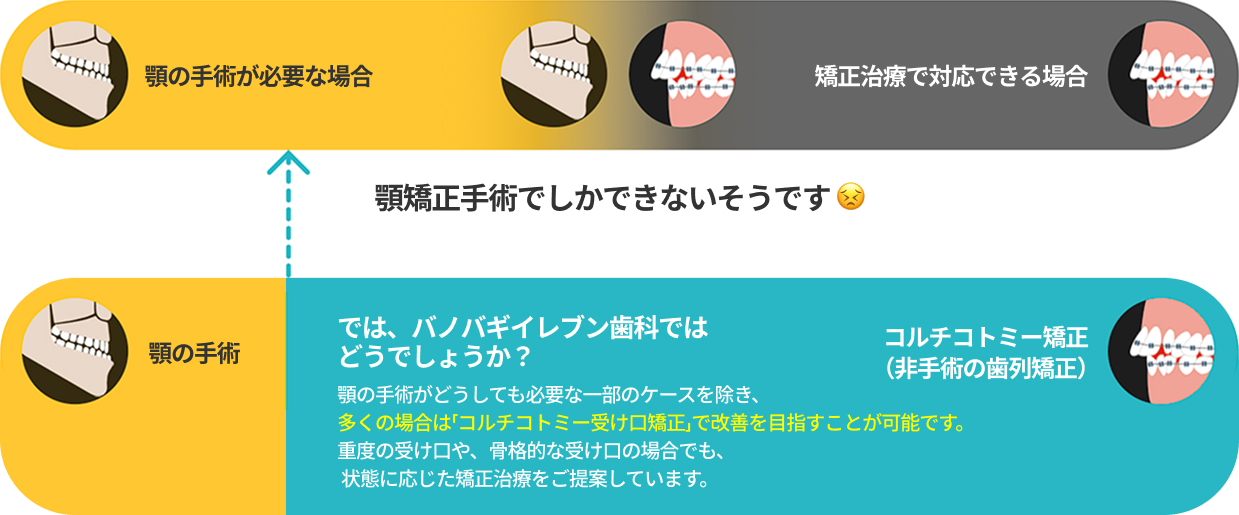 コルチコトミー受け口矯正は、 手術を行わずに受け口の改善を目指す バノバギイレブン歯科独自の矯正治療です。 従来の非手術による受け口矯正では、 下の歯を後ろに下げて噛み合わせを整えることが中心でした。